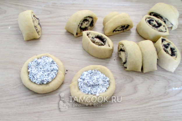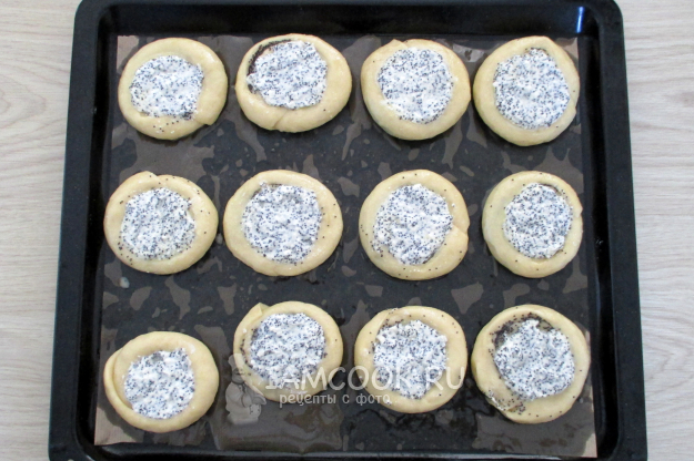 В это углубление нужно добавить порцию творожно-маковой начинки. Уложите заготовки на смазанный или проложенный промасленной пекарской бумагой противень. Дайте минут десять расстояться.