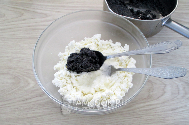 Для начинки перемешайте половину маковой начинки, всю молочную часть от варки мака, слегка взбитый в мягкую пену белок, ванилин и творог.