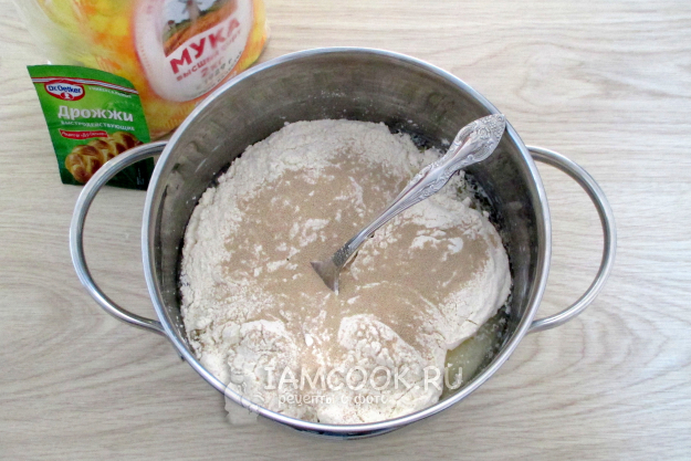 Добавьте муку с сухими дрожжами. У разных производителей количество дрожжей в упаковке в граммах на 500 г муки варьируется.