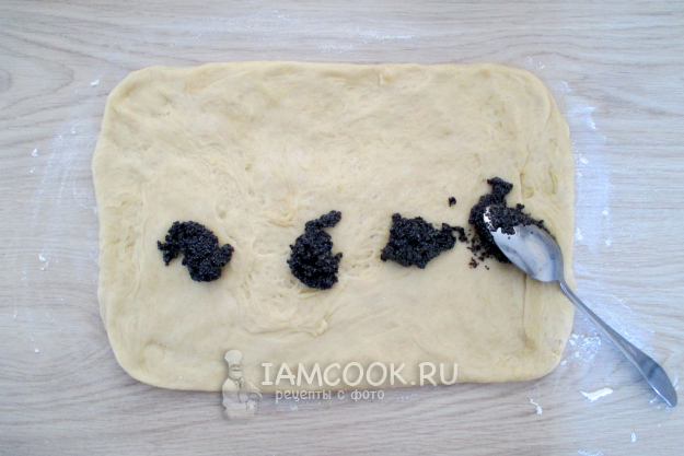 Раскатайте тесто в прямоугольный пласт толщиной около 5 мм на присыпанной мукой поверхности. Нанесите на него вторую половину массы из мака (уже без молока!).