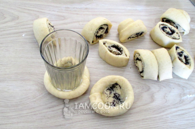 Скрутите в рулет и разделите на заготовки (у меня их 12 штук). Каждый кусок-рулет из теста с прослойкой мака расплющите, и дном стакана сделайте углубление, как показано на фото. Чтобы стакан не прилип к тесту, окуните его низ немного в муку.