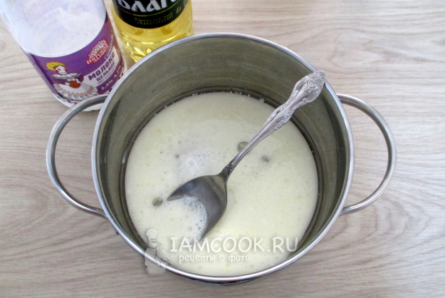 Для теста соедините теплое молоко с растительным маслом, солью и сахаром.