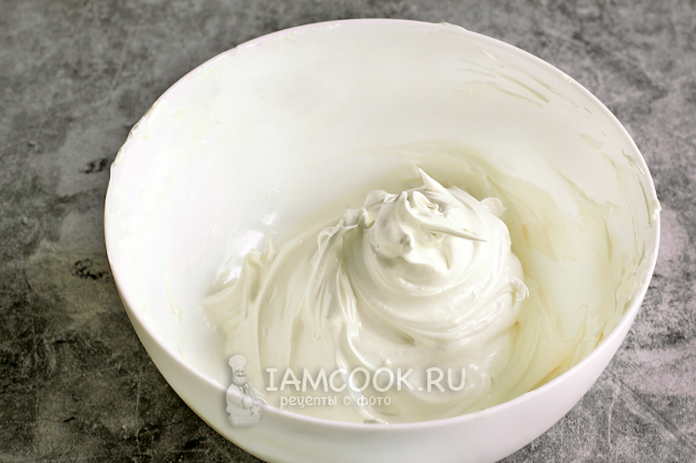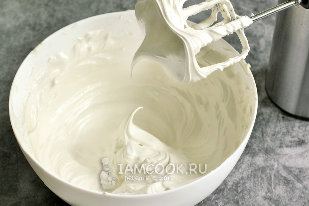 Как показано на фото ниже, белки должны стать вот такой консистенции. Начните вливать слегка остывший сироп тонкой струйкой, не прекращая взбивания белков.