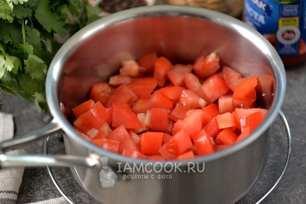 Вырежьте место плодоножки, помидоры нарежьте кубиком, переложите в сотейник к луку. Тушите помидоры на умеренном огне минут 5.