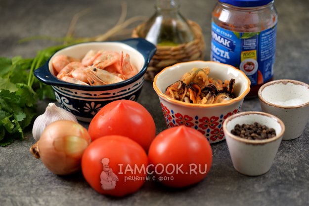 Для приготовления томатного супа с мидиями и креветками нам понадобятся все эти продукты. Лук и чеснок почистите, помойте вместе с помидорами и кинзой. Морепродукты заранее разморозьте. Желательно, чтобы кинза была с корешками.