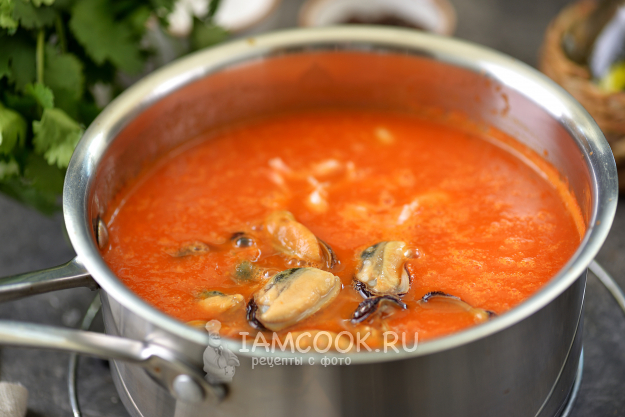 Выложите в суп очищенные хвосты креветок и мидий, проварите минуты 2, не дольше.