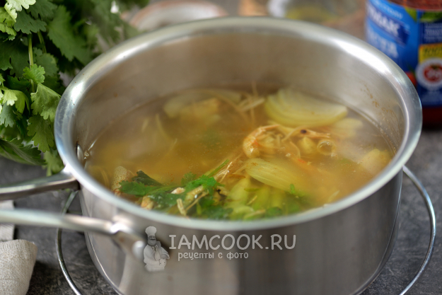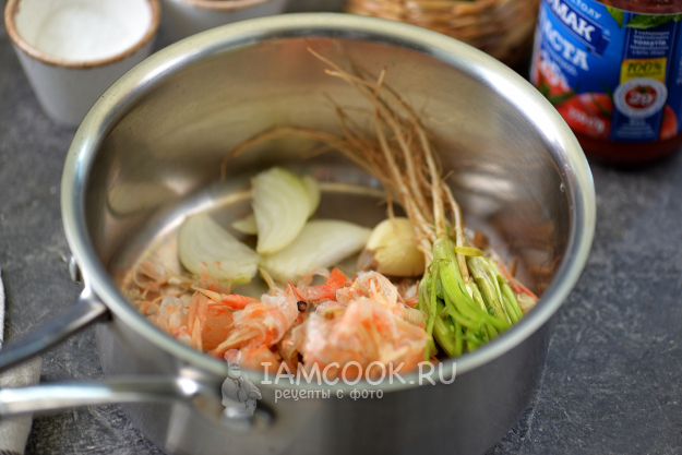 Переложите креветочные панцири в сотейник, добавьте раздавленный зубчик чеснока, несколько ломтиков лука и корни кинзы.