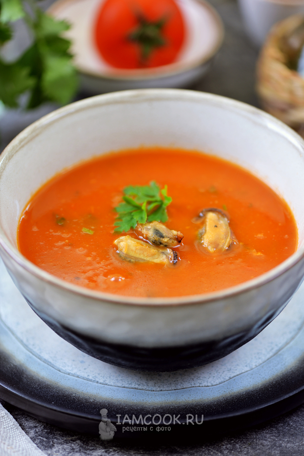 Очень вкусный томатный суп с мидиями и креветками разлейте по тарелкам и подавайте. Можно подать к нему ржаные сухарики, с ними будет еще вкуснее.