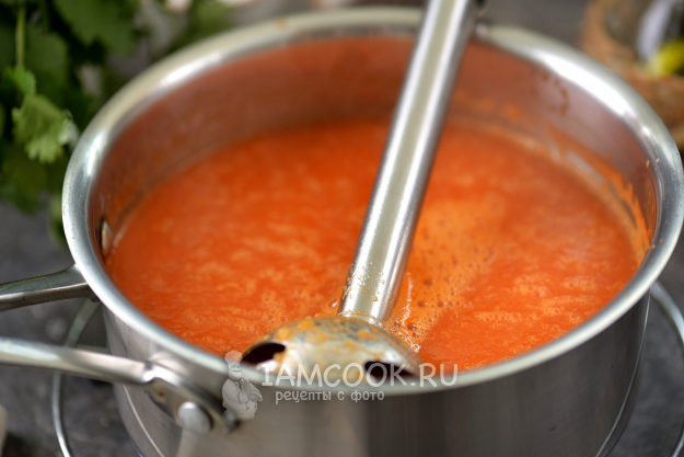 Пробейте суп погружным блендером до однородного состояния, посолите и поперчите по вкусу. При желании можно добавить немного сахара для баланса, если получилось кисловато.
