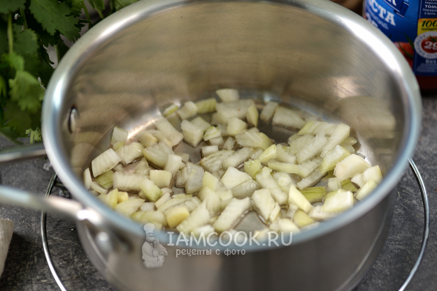 Влейте немного растительного масла в сотейник, добавьте нарезанный кубиком репчатый лук и чеснок, обжарьте несколько минут до мягкости.