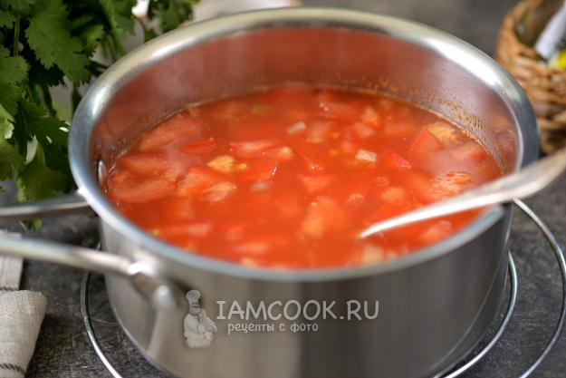 Влейте бульон, добавьте ложку томатной пасты и варите на умеренном огне минут 10.