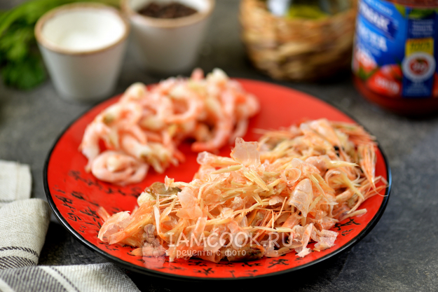 Первым делом очистите креветок от панцирей.