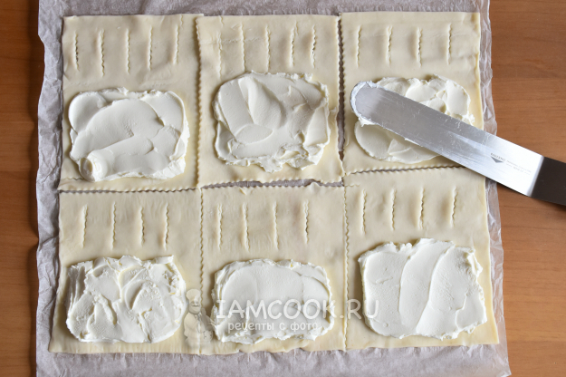 На вторую половину каждого прямоугольника (без надрезов) выложить по 1 ст.л. творожного сыра и аккуратно распределить.