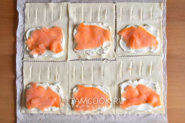 Выпекать слойки с красной рыбой в разогретой до 180 градусов духовке 20 минут, до золотистого цвета. Остудить на решетке.