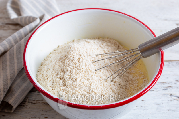 Овсяные хлопья измельчите в кофемолке в муку и добавьте в яично-молочную смесь. Перемешайте, чтобы не было комочков.