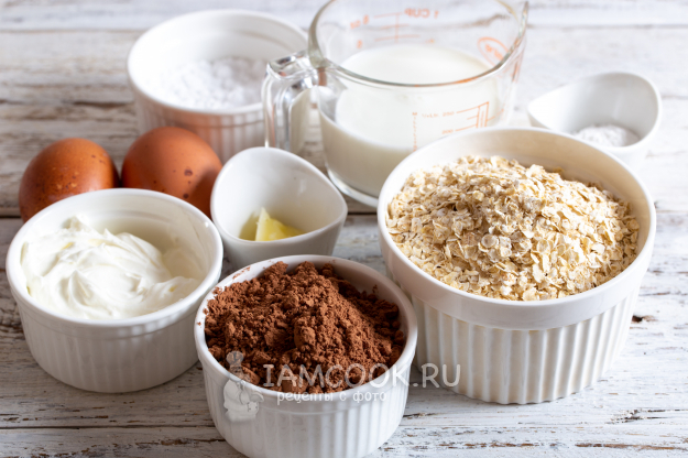 Возьмите указанные ингредиенты для приготовления ПП брауни на сковороде. Молоко и сметану возьмите с маленьким процентом жирности. Для смазывания сковороды я использую топлёное масло.