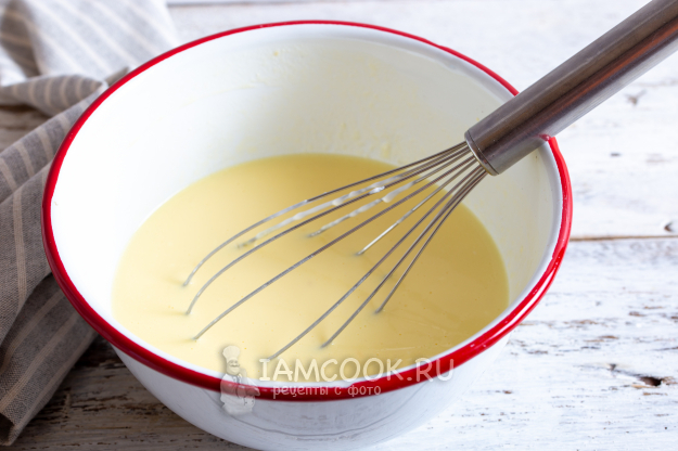 В глубокой миске смешайте разбитые сырые яйца, сметану и молоко.