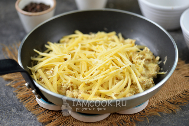 Когда яичная масса полностью приготовится, всыпьте тертый твердый сыр, который хорошо плавится при высокой температуре.