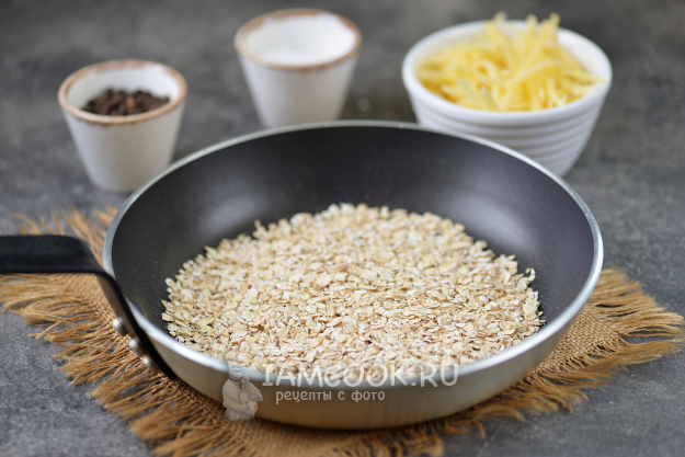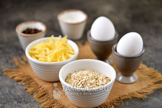 Для приготовления жареной овсянки с яйцом на сковороде вам понадобятся эти продукты. Хлопья берите мелкого помола быстрого приготовления. Сыр сразу натрите на крупной терке.