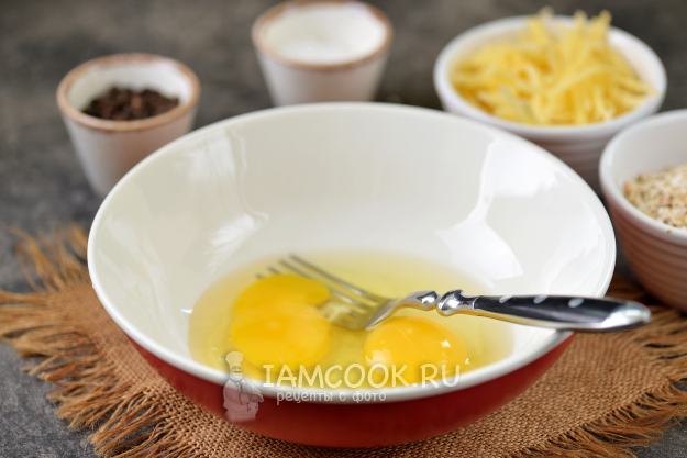 Первым делом взбейте два мелких яйца в глубокой миске обычной вилкой или венчиком, отставьте пока в сторону.