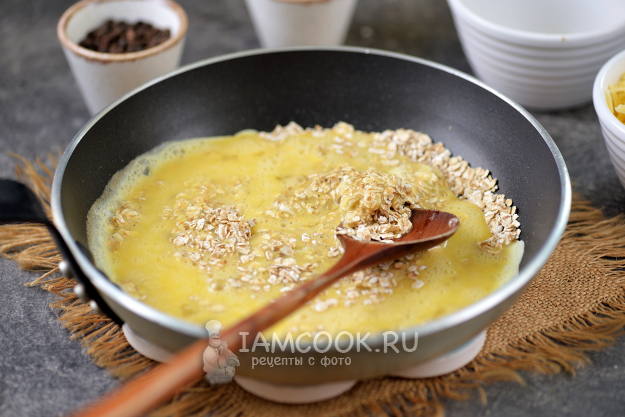Всыпьте хлопья на сухую сковороду с антипригарным покрытием, начните поджаривать их на умеренном огне. Хлопья должны чуть-чуть подрумяниться, от них пойдет приятный ореховый аромат.
