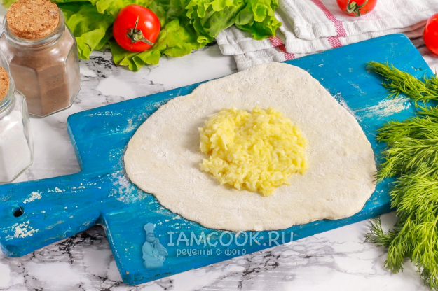 Раскатайте часть теста в лепешку и выложите на нее 1 ст.л. сырной начинки.