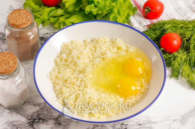 Сыр натрите в глубокую емкость на терке с мелкими ячейками и вбейте туда же 1-2 куриных яйца. Тщательно все перемешайте.