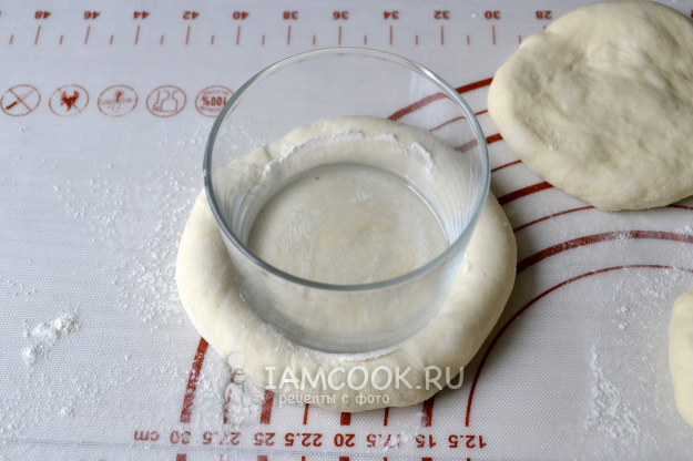 Руками или скалкой раскатайте шарик теста в лепешку толщиной около 1 см. Донышком стакана сделайте углубление в лепешке, чтобы получились бортики. Обмакивайте каждый раз донышко стакана в муку, чтобы не прилипало к тесту.