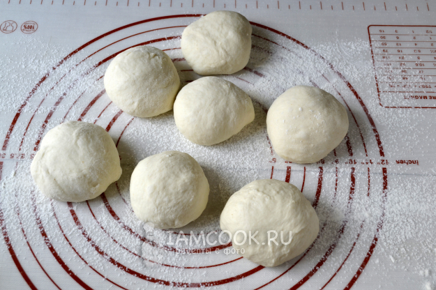 Минут через 15-20 разделите тесто на равные небольшие кусочки. Оставьте на 5-10 минут, прикрыв чистым полотенцем.
