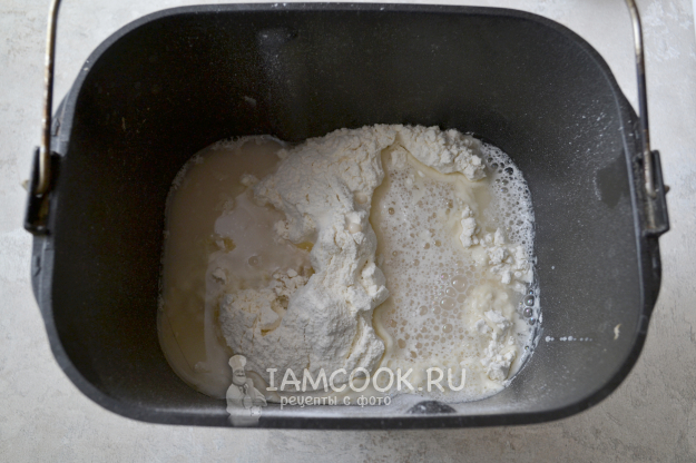 В ведерко хлебопечки просейте муку, добавьте сахар и соль, влейте оставшуюся теплую воду, распустившиеся дрожжи и растительное масло.