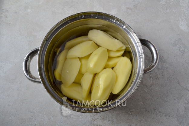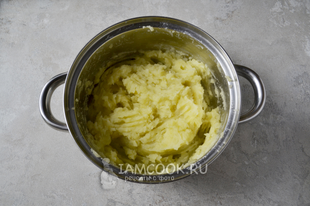 С готового картофеля слейте воду, добавьте растительное масло и истолките картошку в пюре.