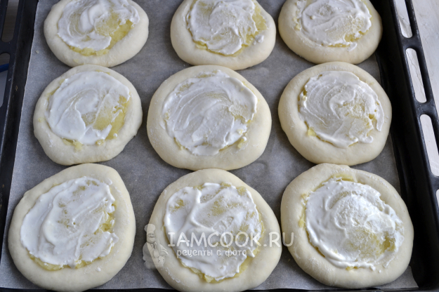 Смажьте картофельное пюре на каждой лепешке постным майонезом. Оставьте для расстойки на 15-20 минут.