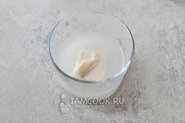 Прессованные дрожжи залейте теплой водой (100 мл), оставьте на 10-15 минут, чтобы разошлись.