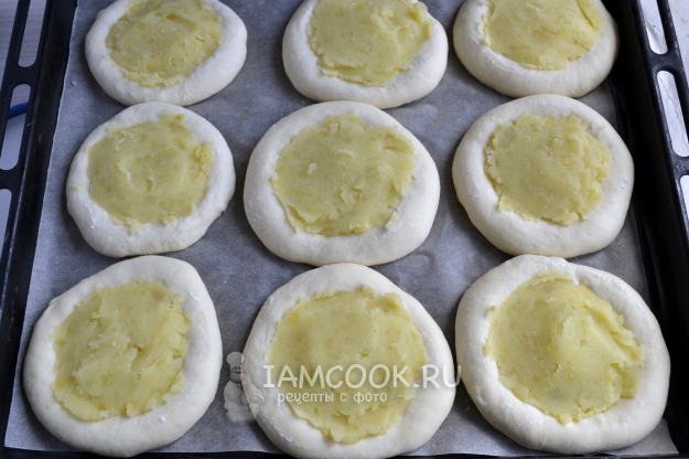 Положите картофельную начинку на лепешки, не выходя за бортики.