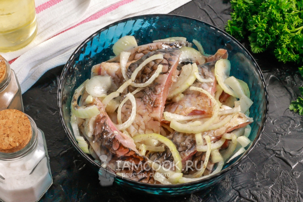 Сахар я в маринад не добавляю, потому что караси сами по себе слегка сладковатые. А вот норму уксуса каждый волен выбирать по своему вкусу - мне подходит такое сочетание уксуса и масла. Но вы сначала соедините в отдельной емкости масло, 3 ст.л. уксуса, соль и перец и перемешайте. Попробуйте на вкус. Если вам будет мало, то влейте еще 1 ст.л. уксуса. Если нормально, то оставьте маринад в таком виде. Не забывайте, что луковая нарезка тоже втянет часть маринада в себя и он станет менее выраженным.
