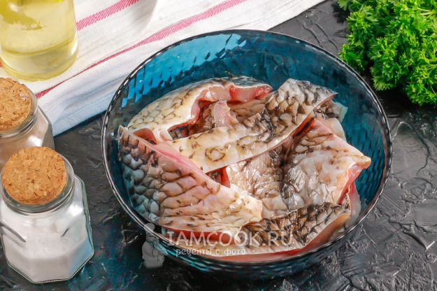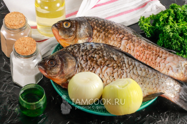 Возьмите необходимые ингредиенты для приготовления вкусной холодной закуски из маринованных карасей в уксусе. Рыбу очистите от чешуи, вспорите брюшко и удалите внутренности и черную пленку. Черная пленка находится на боках внутри брюшка - ее удалять обязательно, она очень горчит! Промойте тушки карасей внутри и снаружи.