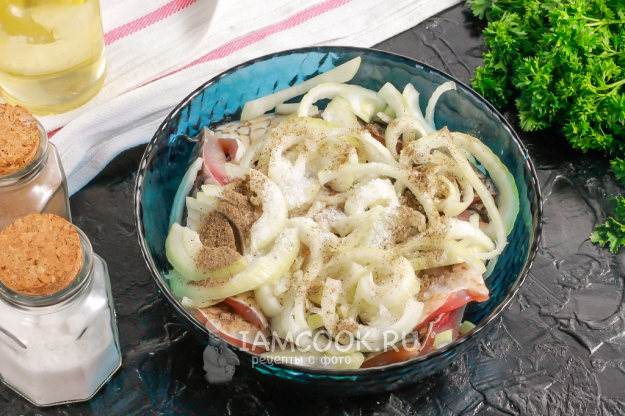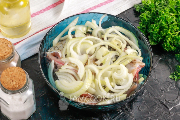 Очистите репчатый лук от кожуры и промойте в воде. Нарежьте полукольцами, но не тонкими. Добавьте в емкость к рыбной нарезке.