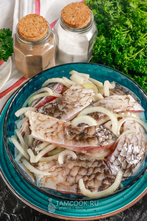 Выложите в узкую емкость слоями. В узкой посуде маринада вам полностью хватит, чтобы покрыть им кусочки карасей. Накройте крышкой, но не плотно, и поместите емкость с заготовкой на холод либо в холодильник. Маринуйте 2-3 дня. Каждый день перемешивайте закуску для равномерного приготовления.