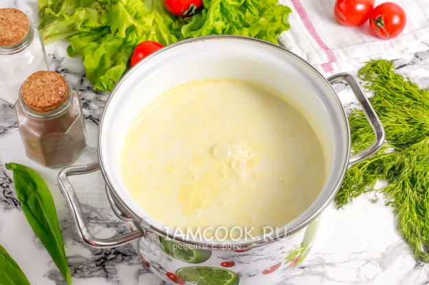 Влейте скисшее молоко любой жирности в кастрюлю или казан. Поместите емкость на плиту.