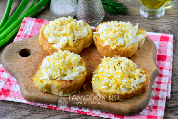 Присыпьте тосты натертыми яйцами. Добавьте соль и черный молотый перец. При желании можете добавить красный острый молотый перец.