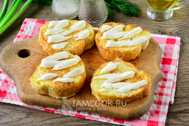 Обжаренные тосты полейте майонезом - так начинка будет хорошо прилипать. Плюс ко всему майонез придаст тостам дополнительный вкус.