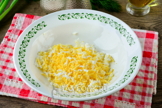 Куриное яйцо сварите вкрутую и остудите. Я варила 8 минут в кипящей воде. Сваренное яйцо натрите на мелкой терке.