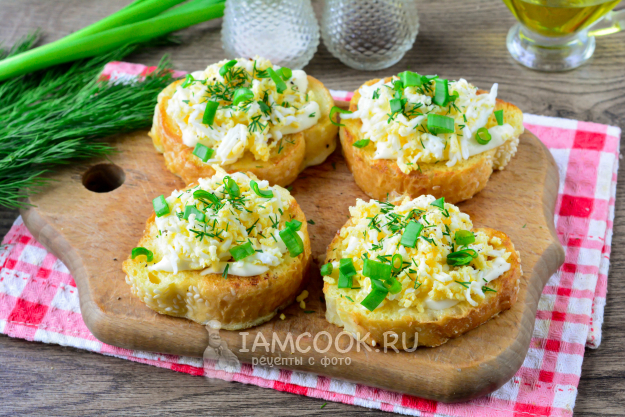 Присыпьте тосты мелко нарезанной зеленью. У меня зеленый лук и укроп. Также можете использовать и петрушку.
