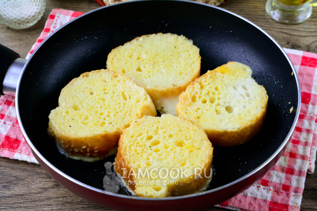 Обжаривайте тосты с двух сторон по 2-3 минутки с каждой стороны. Тосты должны стать румяными. Кроме того, после обжаривания бутерброды станут нежными и мягкими, пропитанными яйцом.