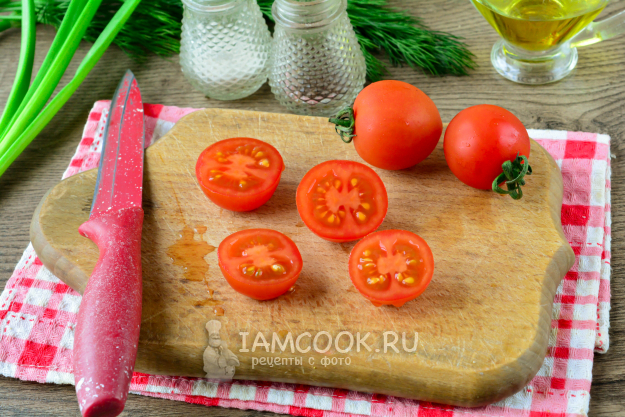 Помидоры черри разрежьте пополам. Лучше не вдоль, а поперек - так красивее разрез.