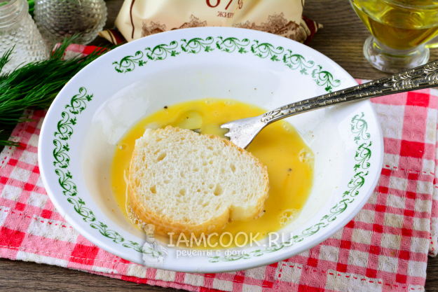 Одно яйцо взболтайте вилочкой, добавьте соль и черный перец по вкусу. Каждый кусочек багета окуните в яичную смесь со всех сторон.