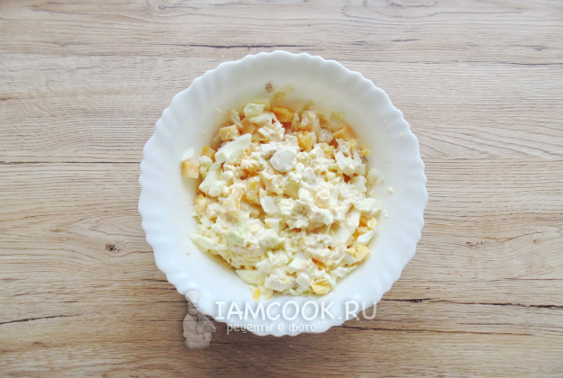 Яйца сварите вкрутую, охладите, очистите и нарежьте. Добавьте в салат измельченный зубчик чеснока. Заправьте майонезом, посолите и поперчите по вкусу. Перемешайте все ингредиенты салата.