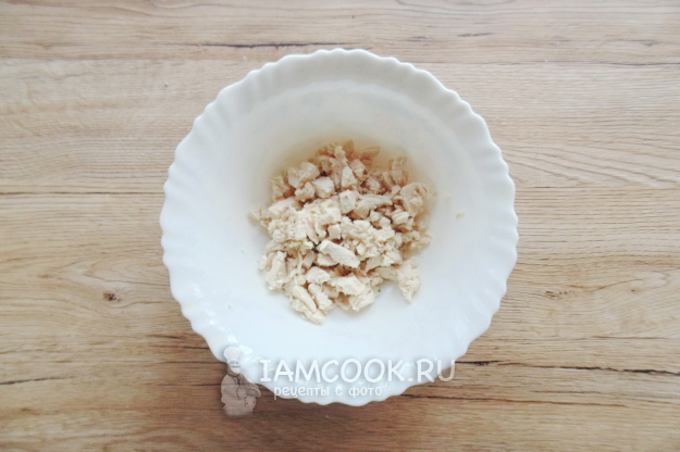 Если у вас сырая курица, то отварите её до готовности в слегка подсоленной воде и остудите.
