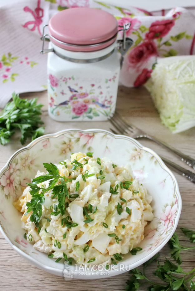 Салат "Нежность" с пекинской капустой и курицей готов. Украсьте салат по вкусу и подавайте к столу.