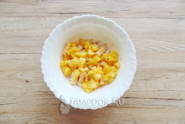 Консервированный ананас нарежьте так же, добавьте в салатник.